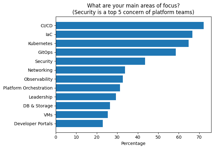 The following chart, presented at the Platform Engineering Executive Roundtable, shows the main areas of focus of platform teams as documented by the platformengineering.org survey from 2025: