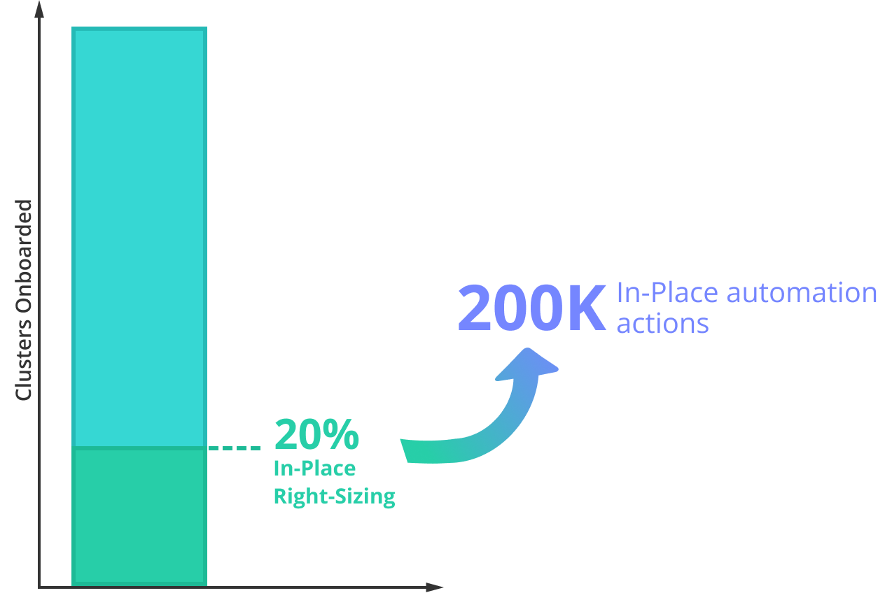 One common point of friction in autonomous optimization is that vertical scaling often requires pod restarts, creating risks of service disruption. This can put teams off from updating resources, leading to over-provisioning and wasted K8s spent. Autonomous optimization in-place addresses this issue by right-sizing workloads without restarts, making optimization smoother and reducing K8s cost without risks of downtimes. Today, we can see that more and more teams are comfortable adopting in-place optimization in production. Almost 20% of our customers are already running Kubernetes versions that support in-place workload resizing, enabling in-place automation across around 21% of clusters onboarded to PerfectScale.