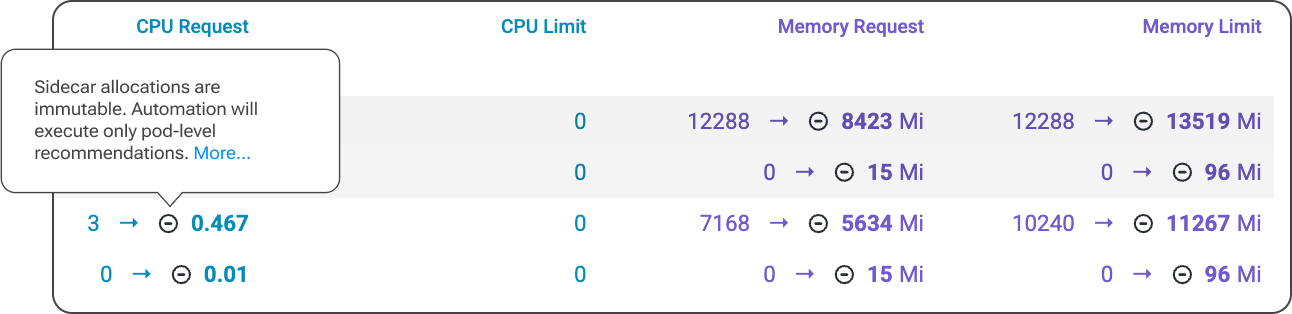 Another safety aspect appears when workloads include injected containers. These additional components have their own resource behavior, which standard optimization logic may not take into account. To prevent accidentally breaking dependency chains or resource isolation assumptions, we introduced an algorithm that automatically detects injected sidecar containers and ensures automation respects them.